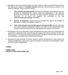 Management announced that lessons will also be broadcast daily on the Ministry of Education Television (MoE TV) on Multi TV, while schools with functional Learning Management Systems have been urged to fully operationalize them during off-campus periods, with support from GES.